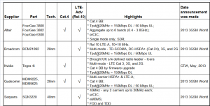 Ohne Zweifel, die Wegbereiter für die nächste Generation von UE hängt von der Bereitschaft der Basisband (BB) Modem -Chipsatz. Daher lassen Sie uns in der Tabelle 1 die Ankündigung Rückblick auf die Verfügbarkeit der BB -Modem -Chipsatz unter den großen Spielern in den vergangenen Monaten .