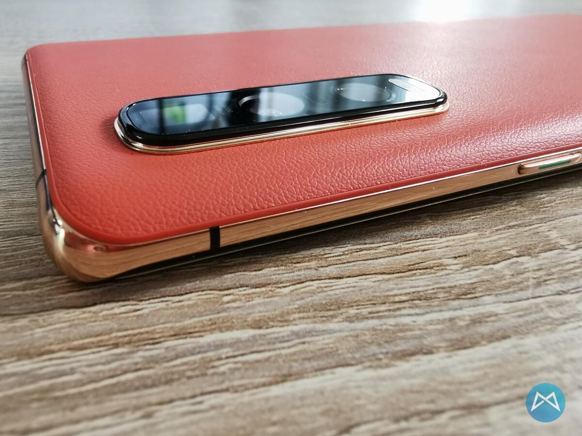 The orange-brown synthetic leather on the back does not allow the smartphone to slide away easily and also does not offer any surface for fingerprints. The golden metal frame between the back and the display makes the device look classy.